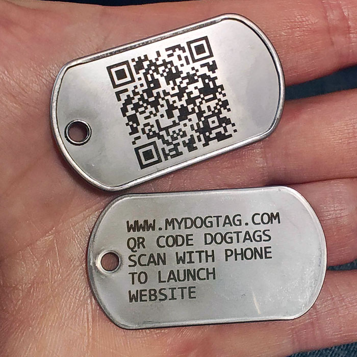We laser engrave your unique QR code onto one side of the dogtag, and your custom text info onto the flip side!